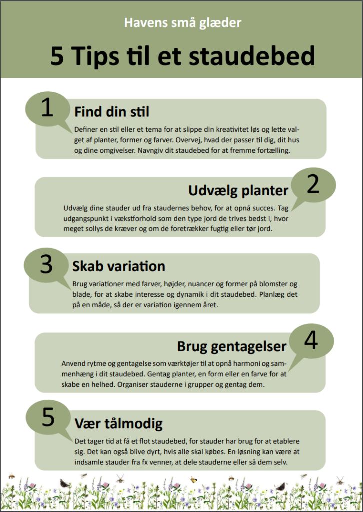 Et flot staudebed kræver tid og tålmodighed. Stauder skal have mulighed for at etablere sig, så planlæg med tålmodighed. Et blomstrende staudebed tager tid at udvikle, og der findes ingen hurtige løsninger, hvis man ønsker et bed, der kan bringe glæde og holde i mange år.